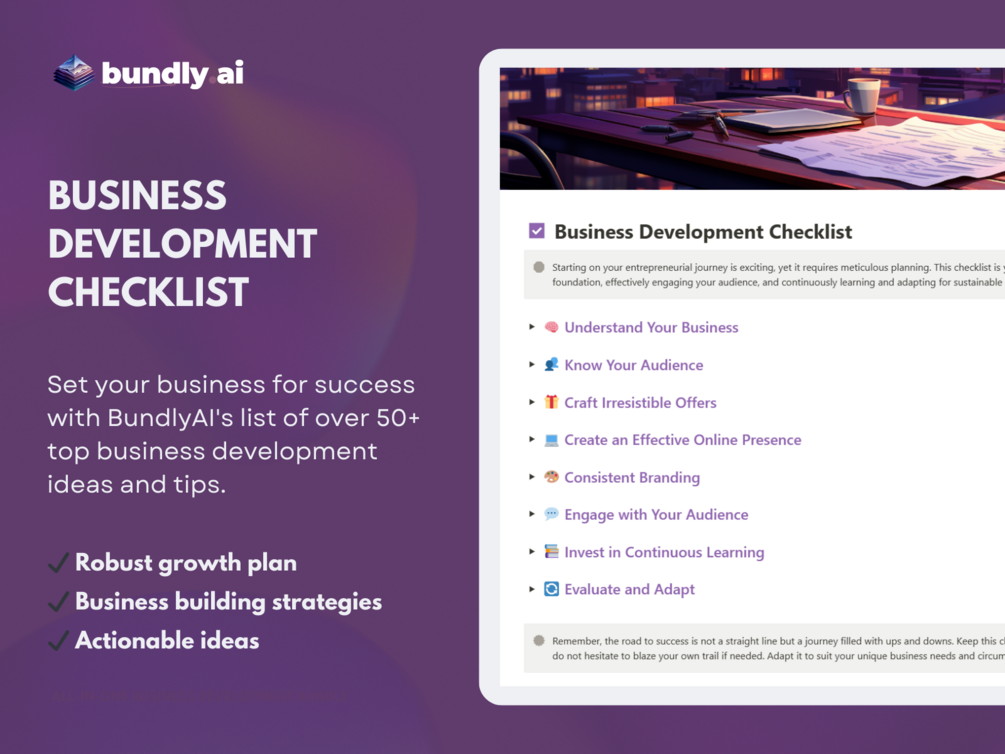 Our checklist is your strategic partner in business growth. For a more comprehensive guide, check out our free case studies or dive into a custom Bundly. This checklist, paired with Bundly, will save you time, provide valuable insights, and fast-track your business success.