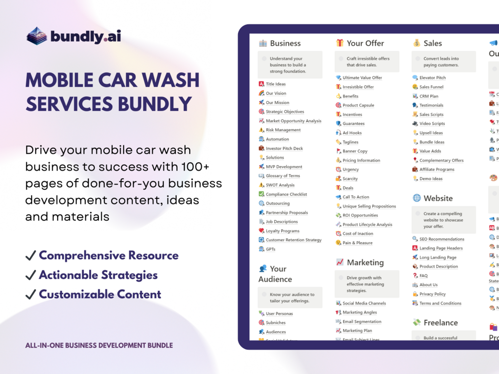 Unlock the vast potential of your mobile car wash and detailing service with Bundly - a meticulously curated treasure trove of business development resources.