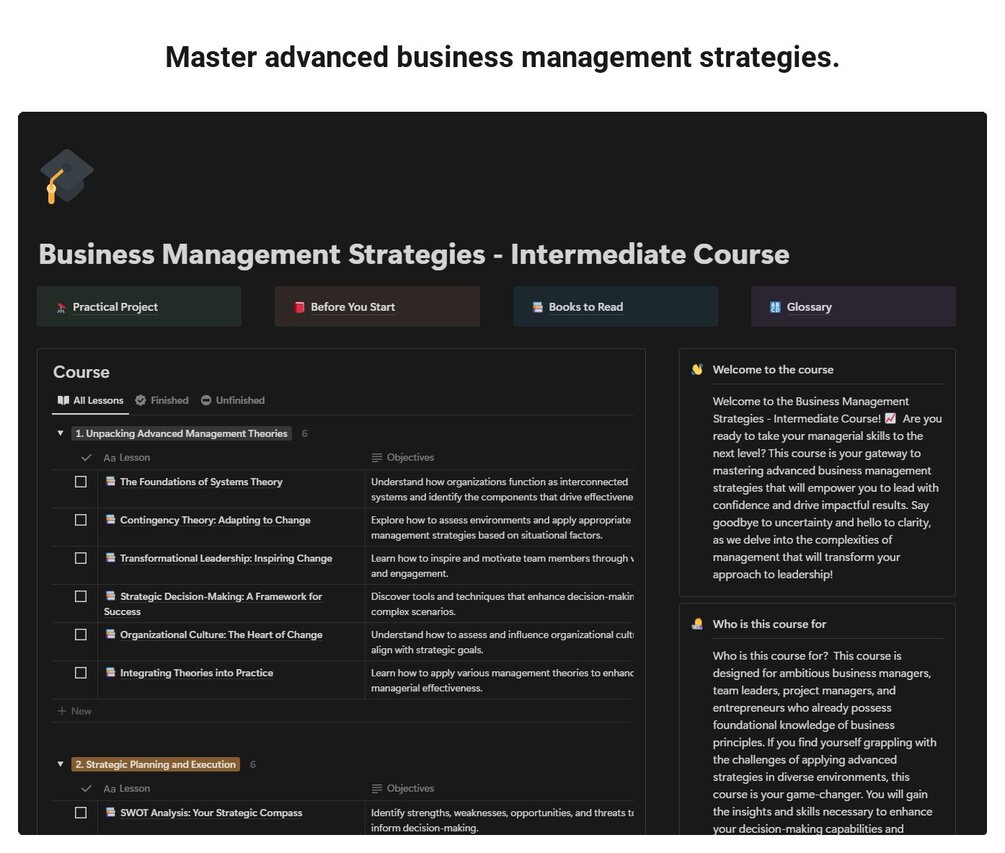 Dive into the world of advanced business management strategies designed for those looking to elevate their managerial skills to new heights. This course goes beyond the basics, exploring complex theories and practical applications that will empower you to lead effectively and make impactful decisions. Expect to engage with dynamic content that challenges your thinking and equips you with the tools to navigate the ever-evolving business landscape.