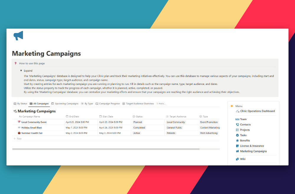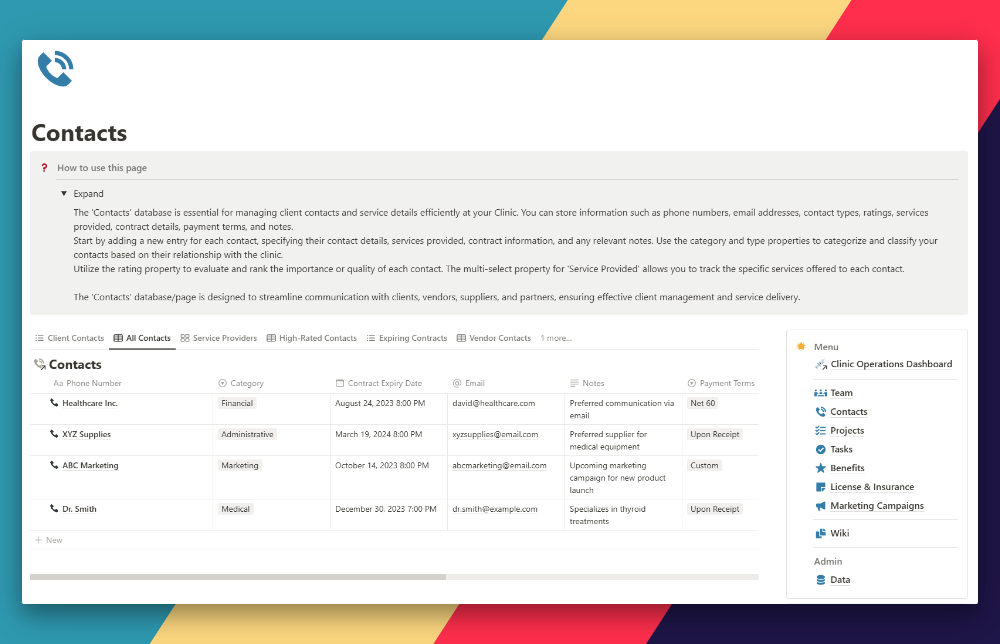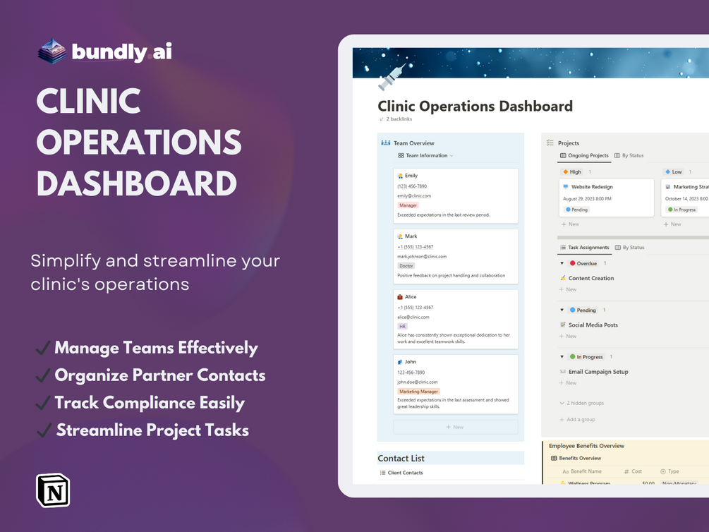 Managing a clinic involves complex and multifaceted tasks. The Clinic Management Notion Template is designed to address these challenges, offering a comprehensive, user-friendly solution to centralize and streamline your clinic's operations.