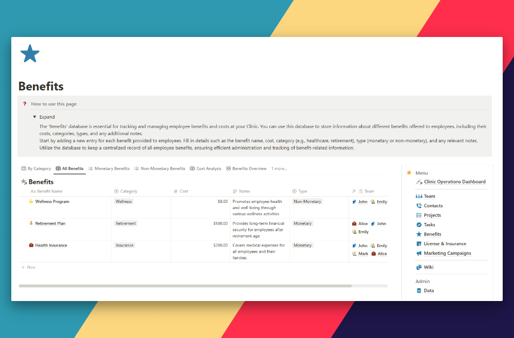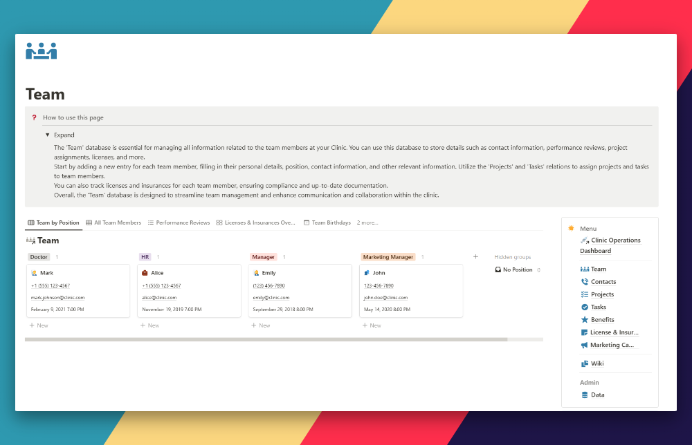 The Clinic Management Notion Template is designed to enhance your clinic's operational efficiency, ensuring that every aspect of your clinic is managed seamlessly in one place.