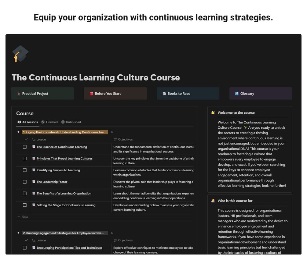 This course includes practical modules and assignments that will guide you through fostering a culture of continuous learning.