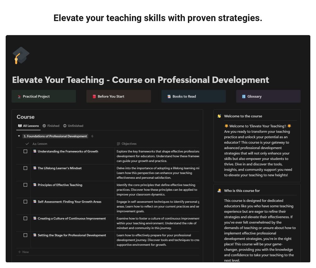 Unleash your potential as an educator with our comprehensive course designed specifically for those looking to elevate their teaching game. Dive deep into advanced strategies for professional growth, discover practical tools, and connect with like-minded educators. By the end of this course, you will not only refine your teaching practices but also develop a personalized growth plan to ensure continuous improvement in your career. Get ready to transform your classroom and inspire your students like never before!